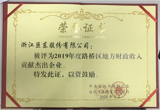 • 2019年度路橋區(qū)地方財政收入貢獻杰出企業(yè)