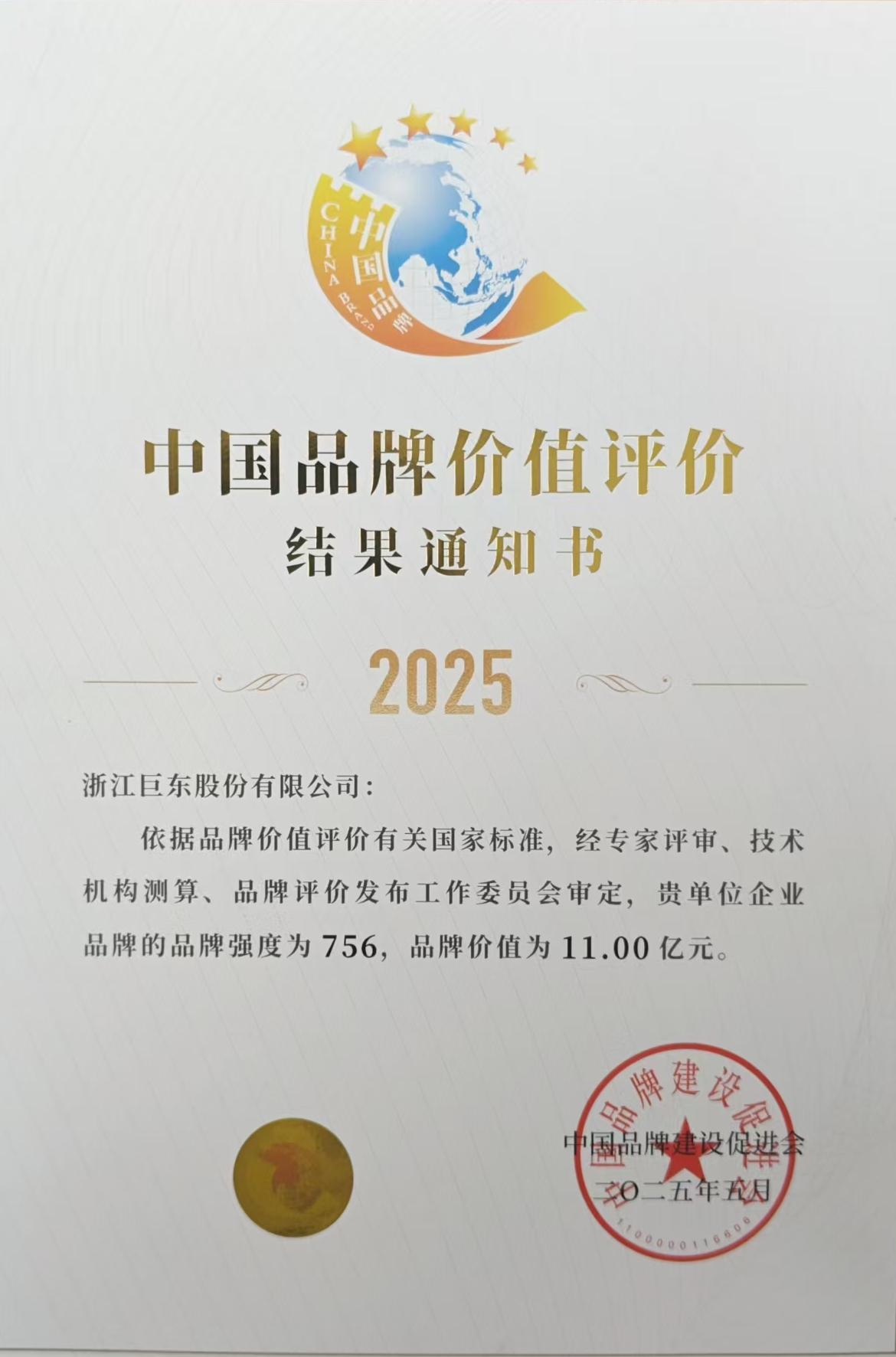 • 2025中國品牌價值評價結(jié)果通知書-品牌價值11億元